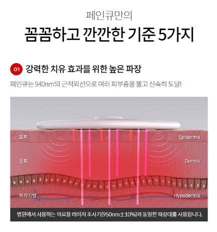 페인큐는 통증 완화 의료용 저출력 레이저 조사기로, 통증 완화를 목적으로 방사되는 광에너지(레이저)를 피부에 쬐어 사용하는 의료 기기입니다.