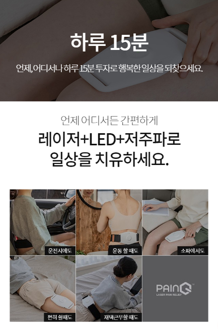 페인큐 PainQ는 레이저 + LED + 저주파 기능을 조합한 치유를 목적으로 하는 조합의료기기(3등급)으로 레이저로 아픈 곳을 싹~ 통증 완화, LED로 따뜻하게~ 온열효과 저주파로 시원하게~ 근육마사지까지 한번에 가능합니다.