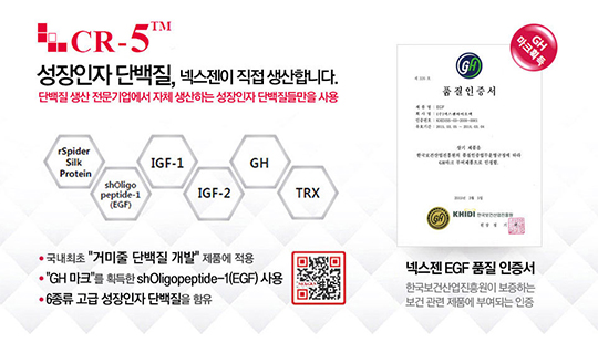 cr5 넥스젠화장품은 인공 거미줄 5종 성장인자 단백질 함유로 피부 탄력 증진, 식약처 인정 영양 성분 21가지 필수아미노산과 9가지 비타민, 11가지 미네랄 함유~!