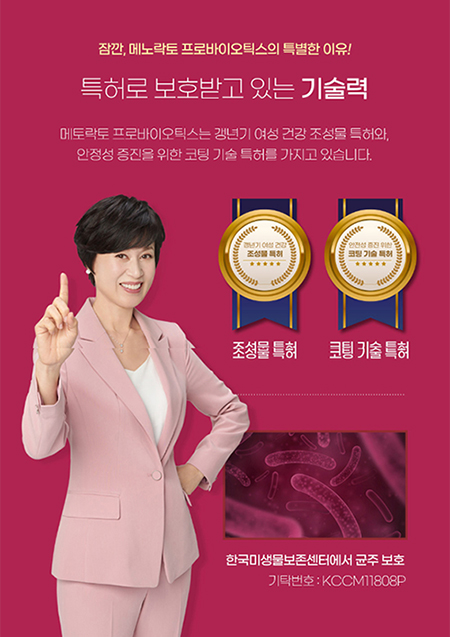 메노락토 프로바이오틱스는 갱년기 여성 건강 조성물 특허와 안정성 증진을 위한 코팅 기술 특허를 가지고 있습니다.