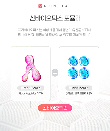 프로바이오틱스는 여성의 몸에서 갱년기 유산균yt1이 장 내에서 잘 생장하여 정착할 수 있도록 먹이가 됩니다.