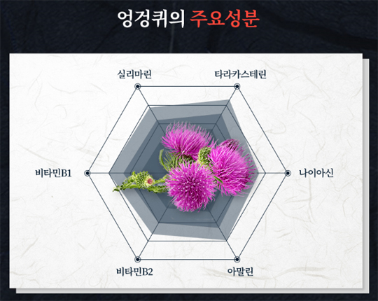 피를 엉퀴게 해서 붙여진 이름 엉겅퀴 주요 성분 (실리마린 · 타라카스테린 · 비타민 B1 · 비타민 B2 · 아말린 · 나이아신) 울릉도에서 자생하는 엉겅퀴는 약성에 우수하고 뛰어나다고 해요.