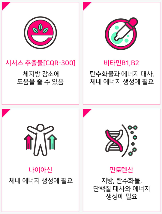 디제로킹 지티 GT 스텝1 원료 시서스추출물 CQR-300 성분 (체지방 감소에 도움을 줄 수 있음) · 비타민B1 & B2 (탄수화물과 에너지 대사에 필요, 체내 에너지 생성에 필요) · 나이아신 (체내 에너지 생성에 필요) · 판토텐산 (지방, 탄수화물, 단백질 대사와 에너지 생성에 필요) 함유되어 있다고 해요.