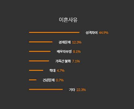 우선 이혼 사유를 보면 성격차이 이혼부터 경제적 문제, 배우자의 부정, 가족 간 불화, 학대, 건강 문제, 기타 사유를 들 수 있습니다.