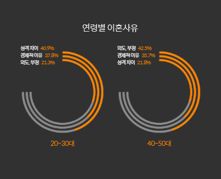 우선 이혼 사유를 보면 성격차이 이혼부터 경제적 문제, 배우자의 부정, 가족 간 불화, 학대, 건강 문제, 기타 사유를 들 수 있습니다.